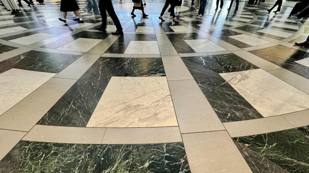 東京駅丸の内南出口の幾何学の大理石床と人間模様 人が交錯するこの場では、天は仰ぐが床の模様を眺める人は少ない(床は旧ドーム時代の天井を床に転写したものという) 床から天井は勿論人の動きさへ美しいここは正に公共ランウェイ
